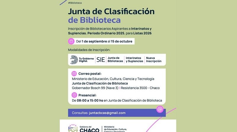 El Ministerio de Educación, a través de la Junta de Clasificación de Bibliotecas, comunica a docentes bibliotecarios de toda la provincia la apertura de inscripción para aspirantes a interinatos y suplencias, Periodo Ordinario 2025, para listas 2026. La misma se llevará a cabo desde el 1 de septiembre y hasta el 15 de octubre.