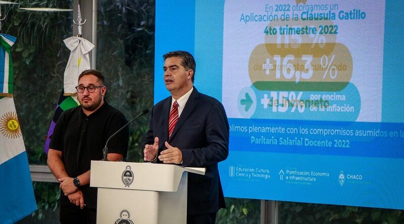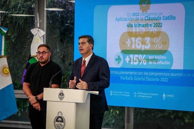 El gobernador Jorge Capitanich, acompañado por el ministro de Planificación, Economía e Infraestructura, Santiago Pérez Pons, anunció este lunes la aplicación de la cláusula gatillo para las y los trabajadores docentes. La medida, implica un 16,3% de aumento y ratifica que el salario de este sector superó por 15 puntos a la inflación registrada en 2022. Será con el pago de los sueldos de enero, previsto para el viernes 27 y el lunes 30.