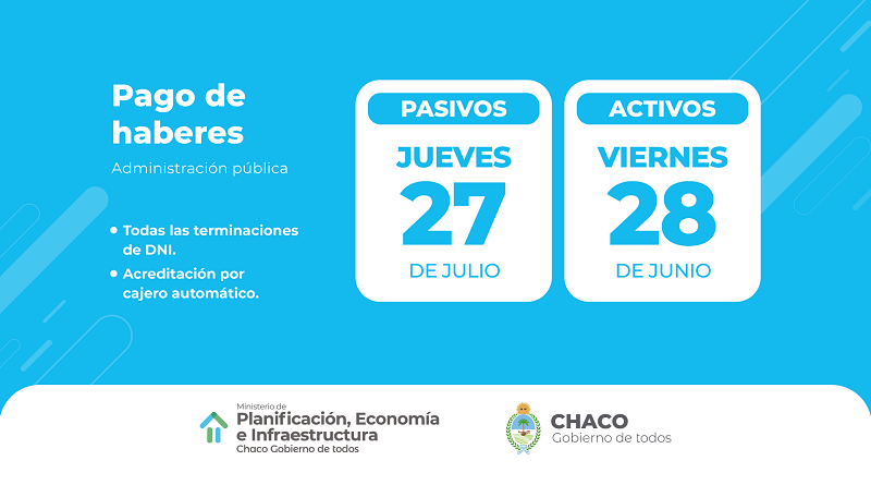 En tanto, el jueves 27 de la próxima semana se pagarán los salarios a las y los jubilados provinciales. Ese día, a partir de las 21, sus haberes estarán disponibles en los cajeros automáticos del Nuevo Banco del Chaco. Un día después, podrán cobrar por ventanilla en las sucursales habilitadas por la entidad crediticia.