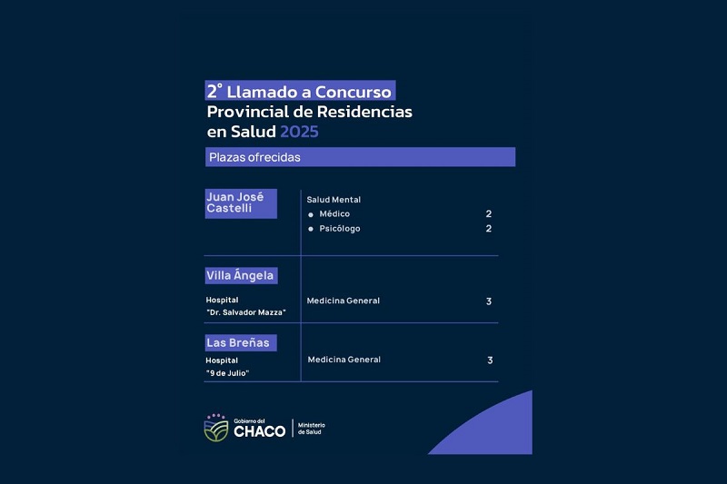 El Ministerio de Salud Pública del Chaco informa que se encuentran disponibles plazas para la realización de residencias en las siguientes especialidades: