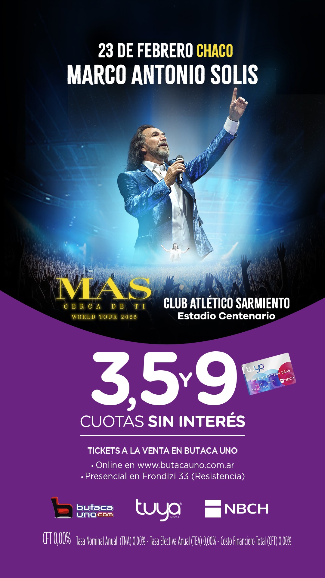 Tarjeta Tuya de Nuevo Banco del Chaco mantiene los planes de cuotas sin interés para comprar entradas al show de Marco Antonio Solís, que se presentará el próximo 23, en el estadio del Club Sarmiento de Resistencia.