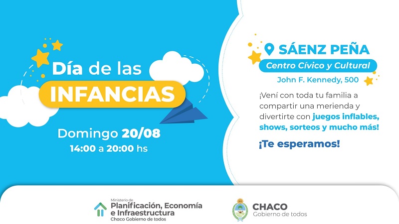Este domingo 20 de agosto, en el marco del Día de las Infancias, el Ministerio de Planificación, Economía e Infraestructura llevará a cabo un evento especialmente dedicado a las chicas y chicos. El encuentro se llevará a cabo en el Centro Cívico y Cultural de Presidencia Roque Sáenz Peña, desde las 14 y hasta las 20 horas.