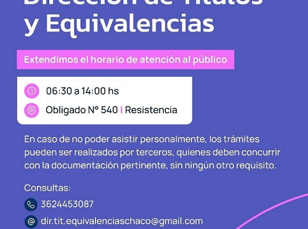 El Ministerio de Educación de Chaco informa que se extendió el horario de atención al público de la Dirección de Títulos y Equivalencias, con el objetivo de agilizar, optimizar y facilitar los diferentes trámites. El mismo será de 6,30 a 14, en su oficina ubicada en Obligado 540 de la ciudad de Resistencia.