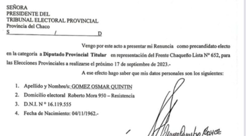 EL FRENTE CHAQUEÑO INFORMA SOBRE LA RENUNCIA DE UN PRECANDIDATO DE LA LISTA 652