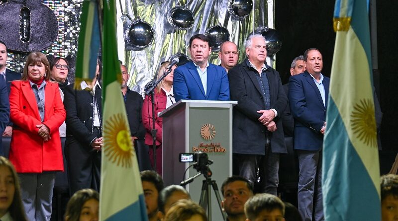 En representación del Gobierno provincial, el ministro de Obras e Infraestructura, Hugo Domínguez, el ministro de Salud, Sergio Rodríguez y el secretario de Asuntos Estratégicos, Marcos Resico, acompañaron anoche al intendente Gustavo Karasiuk y a la comunidad en el acto central por el 78° aniversario de Pampa del Indio.