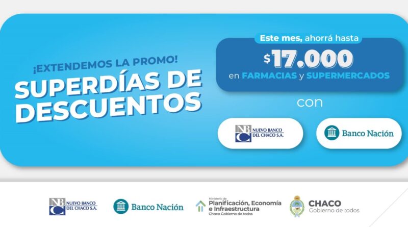 Paralelamente, se mantendrán los descuentos para chaqueñas y chaqueños que cuenten con tarjetas Visa o Mastercard emitidas por el Banco Nación. En el caso de los supermercados, la promoción será el lunes 29 de agosto con 50% de descuento, con un tope de reintegro de $5.000. Para farmacias, los beneficios serán el miércoles 31 con un descuento del 30% y un tope de reintegro $2.000. En total, se puede ahorrar hasta $7.000 con este medio de pago.