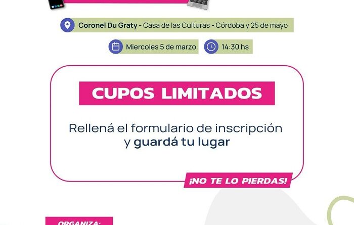 Este taller gratuito se realizará el 5 de marzo, a las 9:00 en el Salón de Usos Múltiples (SUM) de la municipalidad, en Santa Sylvina. Ese mismo día, a las 14.30, el taller se realizará en la Casa de la Cultura (Córdoba y 25 de Mayo), en Coronel Du Graty. Será un taller dinámico, donde abordarán casos prácticos para llevarlos a la realidad.