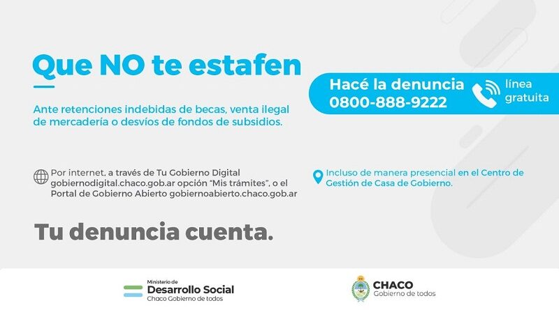 El Ministerio de Desarrollo Social reitera los diversos mecanismos para que las y los chaqueños denunciar potenciales irregularidades en políticas sociales. Entre las cuestiones que se pueden alertar está la venta de módulos alimentarios, los pedidos para retenciones de transferencias sociales. Además de falsos gestores que piden dinero a cambio de gestiones para acceder a programas de la cartera social como microcréditos o herramientas para emprendedoras y emprendedores.
