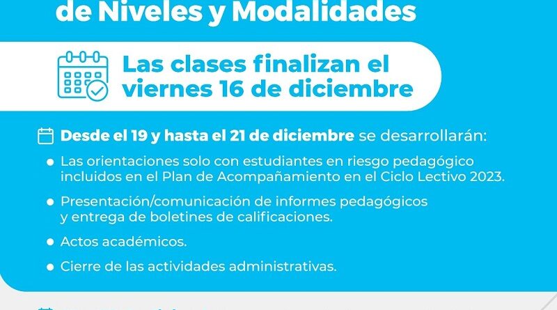 La misma indica que en los últimos días del Período Lectivo 2022, desde el 19 y hasta el 21 de diciembre, se desarrollarán en las instituciones escolares: las actividades de orientación, solo con estudiantes en riesgo pedagógico incluidos en el Plan de Acompañamiento en el Ciclo Lectivo 2023; presentación/comunicación de informes pedagógicos y entrega de boletines de calificaciones; actos académicos; y cierre de las actividades administrativas.