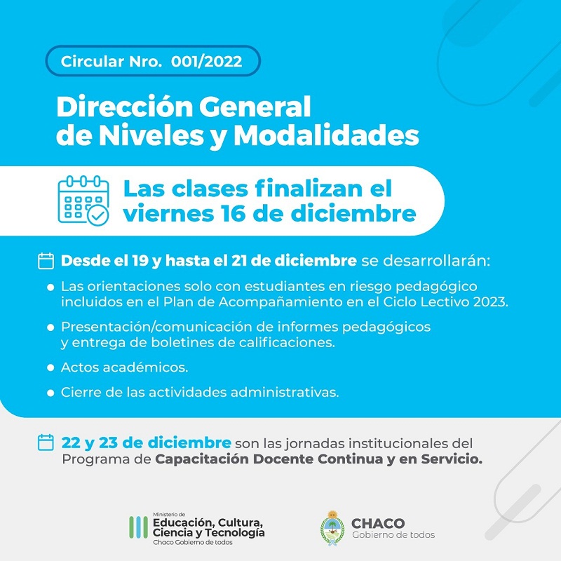 El Ministerio de Educación de la Provincia, a través de la Dirección General de Niveles y Modalidades, emitió la Circular Nº 001/2022, con el fin de comunicar a las supervisoras y los supervisores técnicos, directoras y directores de las instituciones de los niveles obligatorios y modalidades de todas las direcciones Regionales que las y los estudiantes finalizarán las clases el viernes 16 de diciembre.