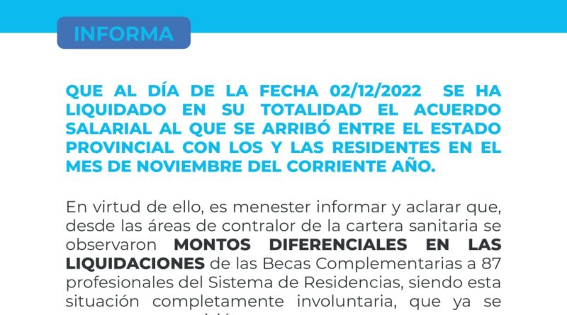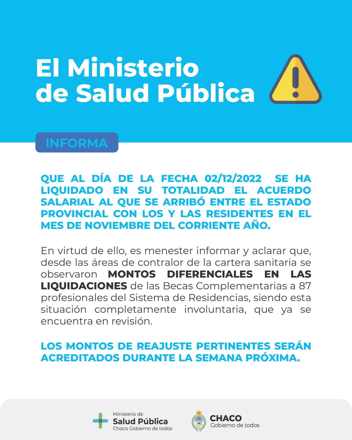 El Ministerio de Salud Pública de la Provincia del Chaco informa que a la fecha, 2 diciembre de 2022, se ha liquidado en su totalidad el acuerdo salarial al que se arribó entre el Estado Provincial con los y las residentes en el mes de noviembre del corriente año.