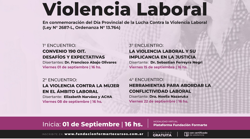 En conmemoración del “Día Provincial de la Lucha Contra la Violencia Laboral” (Ley N° 2687-L y Ordenanza N° 13.764) la Oficina Interdisciplinaria para la Prevención, Tratamiento y Sanción de la Violencia Laboral “Beatriz Vásquez” del Poder Legislativo del Chaco junto con la Oficina para la Prevención, Tratamiento y Sanción de la Violencia Laboral Oscar “Cachito” Ferreyra de la Municipalidad de Resistencia, desarrollarán un ciclo de charlas destinadas al público en general.