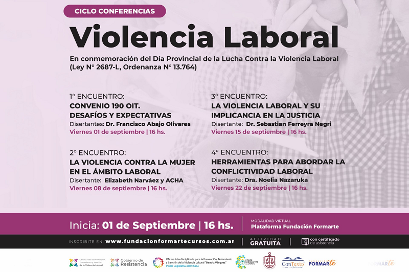 En conmemoración del “Día Provincial de la Lucha Contra la Violencia Laboral” (Ley N° 2687-L y Ordenanza N° 13.764) la Oficina Interdisciplinaria para la Prevención, Tratamiento y Sanción de la Violencia Laboral “Beatriz Vásquez” del Poder Legislativo del Chaco junto con la Oficina para la Prevención, Tratamiento y Sanción de la Violencia Laboral Oscar “Cachito” Ferreyra de la Municipalidad de Resistencia, desarrollarán un ciclo de charlas destinadas al público en general.