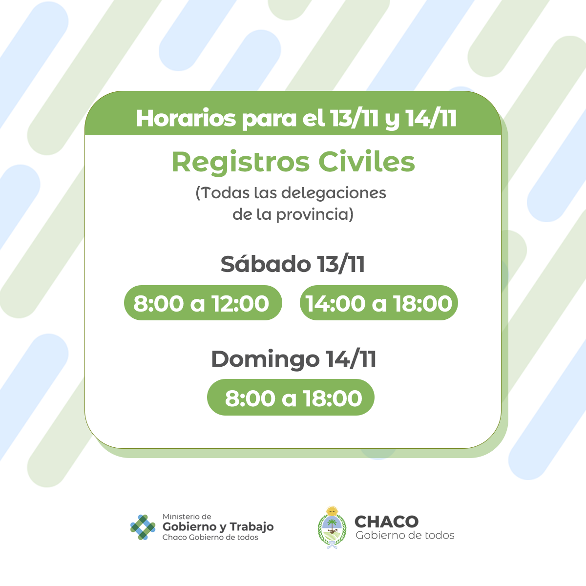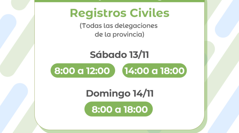 Las oficinas de toda la provincia que tengan guardia atenderán el sábado 13 de noviembre, de 8 a 12 y de 14 a 18, en tanto el domingo 14 habrá horario corrido, de 8 a 18.