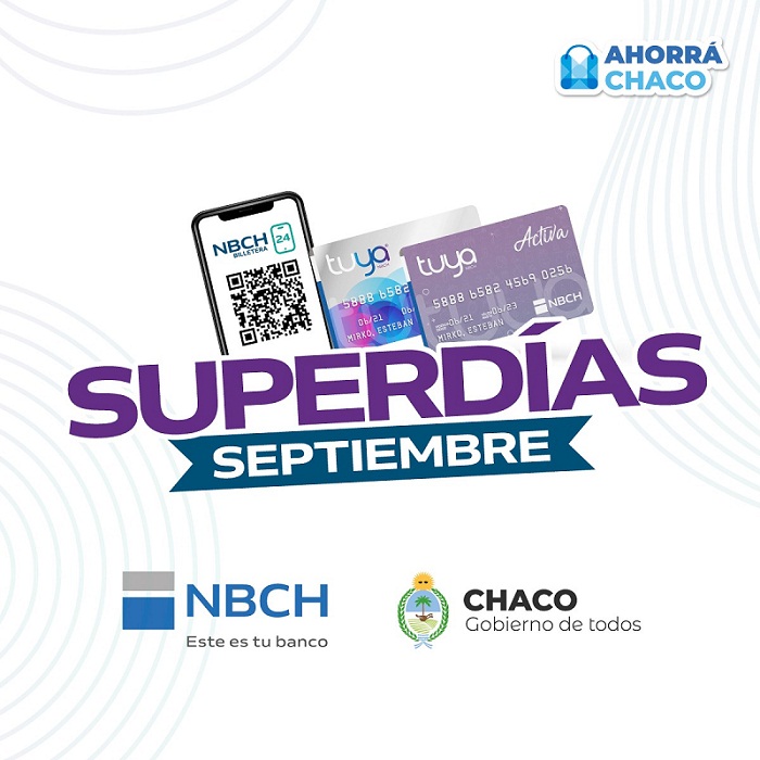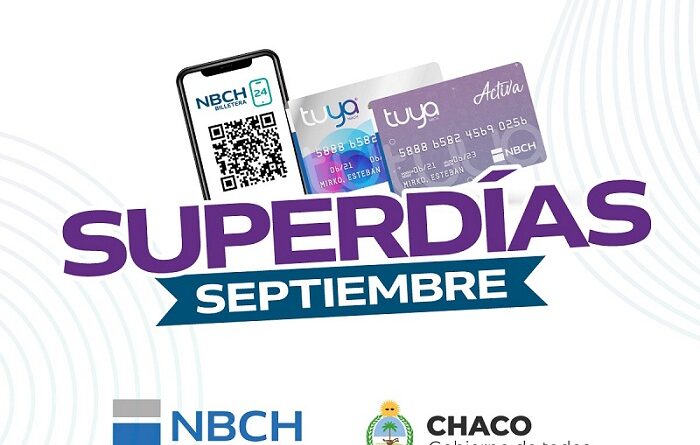 La promoción Superdías de Nuevo Banco del Chaco y el Gobierno Provincial seguirá durante el mes de septiembre para comprar con descuentos en comercios adheridos de la provincia con Tarjeta Tuya y Billetera NBCH24. Los martes y jueves –exclusivo para pasivos de Insssep-, el beneficio es de 30% en farmacias y los miércoles, de 50% en alimentos.
