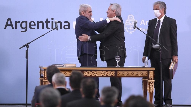 En la ceremonia de esta tarde en el Museo del Bicentenario el presidente Alberto Fernández tomó juramento a Juan Manzur como jefe de Gabinete; a Santiago Cafiero a cargo del Ministerio de Relaciones Exteriores, Comercio Internacional y Culto; a Aníbal Fernández en Seguridad; Jaime Perczyk en Educación; Daniel Filmus en Ciencia y Tecnología; Julián Domínguez en Ganadería, Agricultura y Pesca y, Juan Ross como secretario de Comunicación y Prensa.