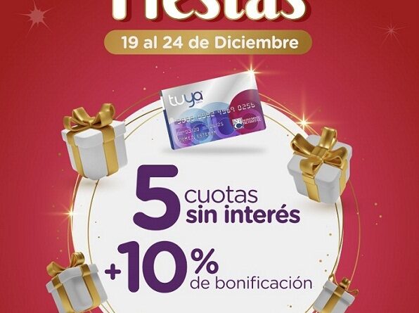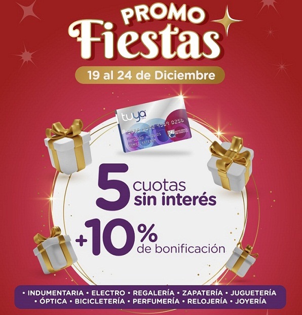 Con la promoción especial de Nuevo Banco del Chaco para celebrar las fiestas, se podrá comprar desde este lunes y hasta el próximo sábado 24, en 5 cuotas sin interés con 10% de bonificación en comercios adheridos de toda la provincia con todas las versiones de la tarjeta chaqueña: Tuya Tradicional, Tuya Joven, Tuya Pyme y Tuya Pyme Rural.