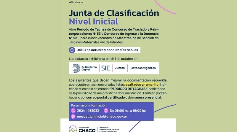 La Junta de Clasificación de Nivel Inicial, comunica a los docentes de Nivel Inicial de toda la provincia, sobre las fechas de los actos de adjudicación de cargos de maestros/as de sección de Jardines Maternales y/o de Infantes del Concurso de Traslado y Reincorporaciones Nº 53 y Concurso de Ingreso a la Docencia Nº 52, que se realizarán en el Salón de Convenciones del Bicentenario, sito en Av. Los Inmigrantes 300, de Resistencia.