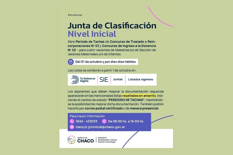 La Junta de Clasificación de Nivel Inicial, comunica a los docentes de Nivel Inicial de toda la provincia, sobre las fechas de los actos de adjudicación de cargos de maestros/as de sección de Jardines Maternales y/o de Infantes del Concurso de Traslado y Reincorporaciones Nº 53 y Concurso de Ingreso a la Docencia Nº 52, que se realizarán en el Salón de Convenciones del Bicentenario, sito en Av. Los Inmigrantes 300, de Resistencia.