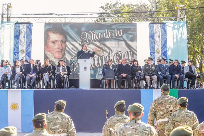 El acto contó con la tradicional promesa a la Bandera Nacional de 150 alumnas y alumnos ante un excombatiente de Malvinas y el juramento de 298 agentes del Ejército Argentino y de la Fuerza Aérea. «Que la bandera argentina flamee en cada rincón de nuestro territorio, para defenderla con trabajo, compromiso, coraje, lealtad y fidelidad como lo hizo Belgrano», sostuvo.