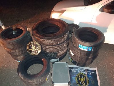 En ese momento, los ocupantes fueron demorados y otro grupo de antinarcóticos se dirigió hasta la vivienda, donde el morador entregó 14 neumáticos nuevos de distintos rodados que los ocupantes del Agile, ocultaron en su propiedad.