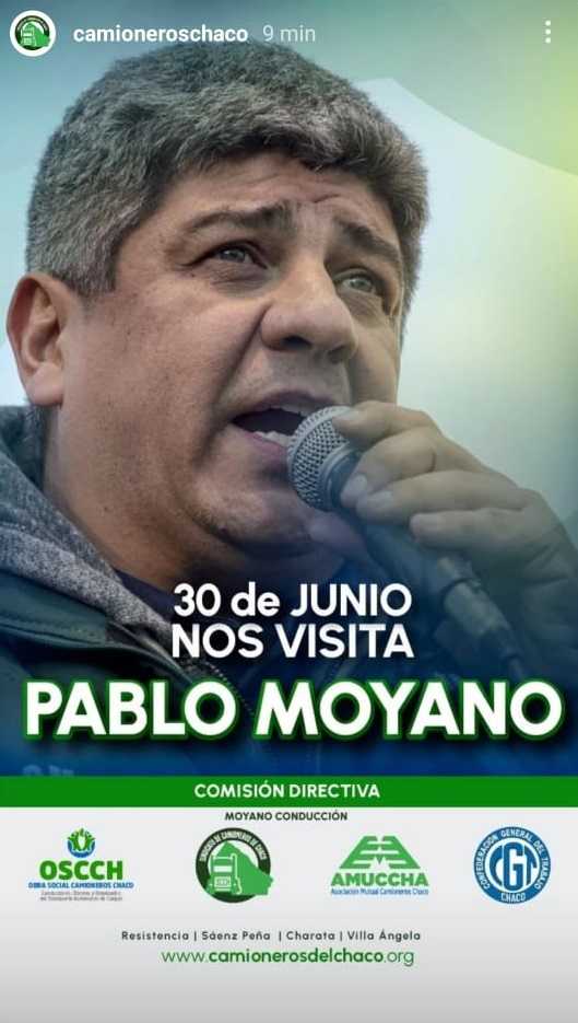 El referente del Sindicato de Camioneros, Pablo Moyano llega mañana a Resistencia para encuentro con trabajadores y gremios. Por la tarde participara de la inauguración de las nuevas instalaciones de la sede sindical en Arbo y Blanco 775.