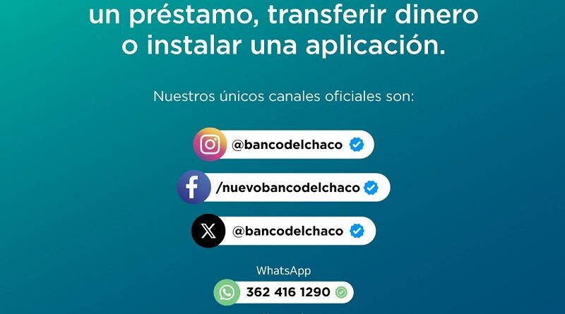 · Redes Sociales: Instagram (@bancodelchaco), Facebook (@nuevobancodelchaco), Twitter (@bancodelchaco) · Atención Online: a través del chat web en www.nbch.com.ar