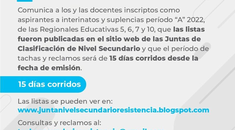 El Ministerio de Educación del Chaco, a través de las Juntas de Clasificación de Secundaria, comunica a las y los docentes inscriptos como aspirantes a interinatos y suplencias período “A” 2022, de las Regionales Educativas 5, 6, 7 y 10, que el período de tachas y reclamos será de 15 días corridos desde la fecha de emisión.