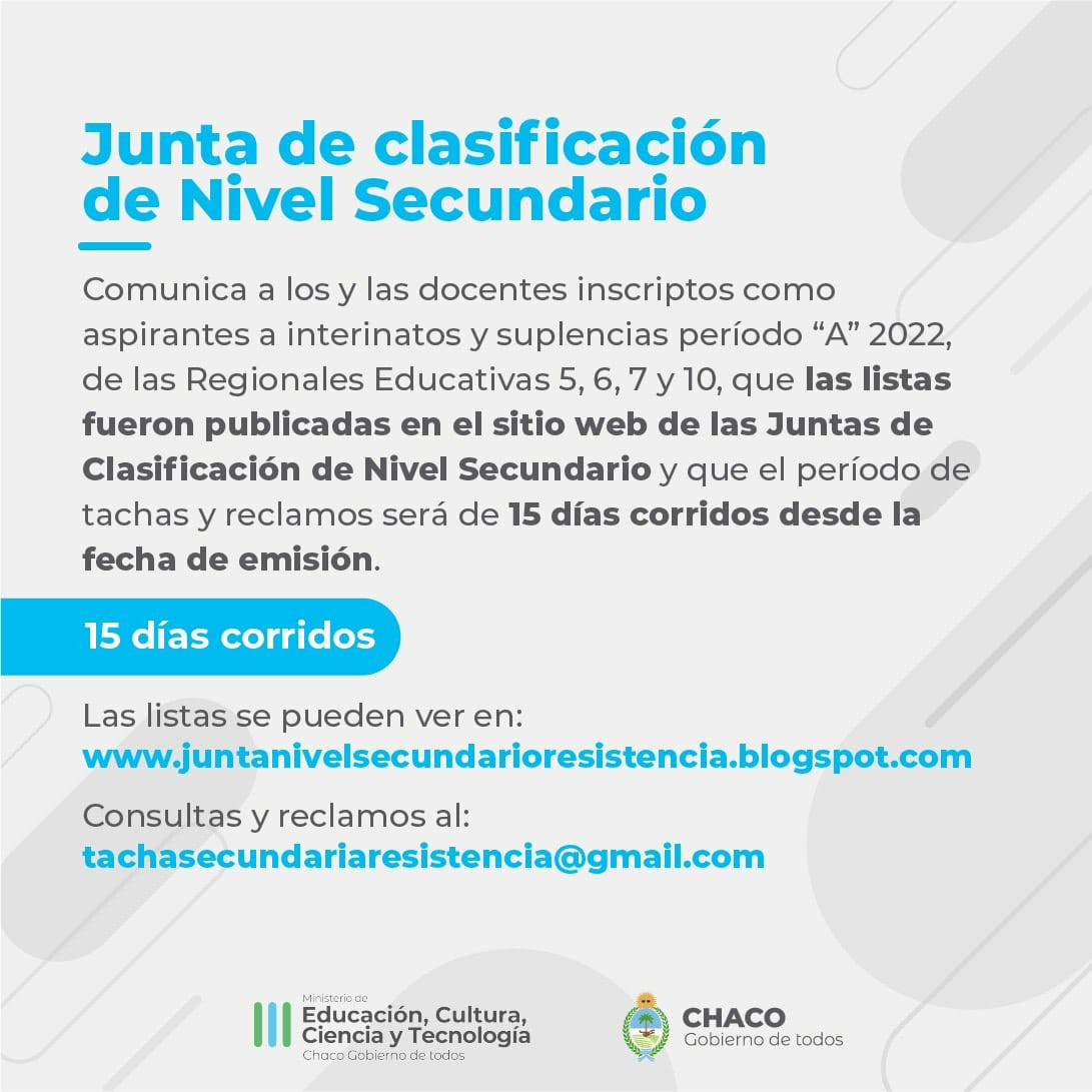 El Ministerio de Educación del Chaco, a través de las Juntas de Clasificación de Secundaria, comunica a las y los docentes inscriptos como aspirantes a interinatos y suplencias período “A” 2022, de las Regionales Educativas 5, 6, 7 y 10, que el período de tachas y reclamos será de 15 días corridos desde la fecha de emisión.