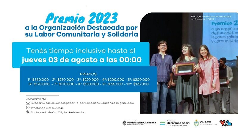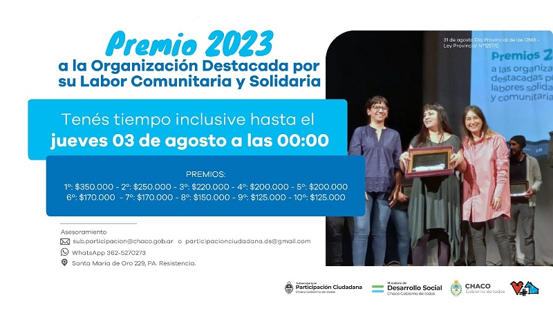 El Ministerio de Desarrollo Social informa que, hasta el jueves 3 de agosto del 2023 inclusive, continúa abierta la convocatoria a participar del Premio Provincial a la ONG Destacada por su Labor Comunitaria y Solidaria Año 2023, a través de la cual se otorgarán estímulos económicos a las organizaciones seleccionadas. El primer premio para la organización elegida será de 350 mil pesos.