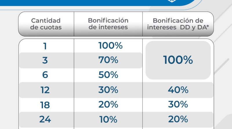 En cuanto a la moratoria de deuda con quita de intereses, el pago contado en 1 cuota tendrá una quita del 100% de interés, en 3 cuotas quita del 70%, en 6 cuotas quita del 50%, en 12 cuotas quita del 30%, en 18 cuotas quita del 20%, en 24 cuotas quita del 10% y en 36 cuotas 0% de quita.