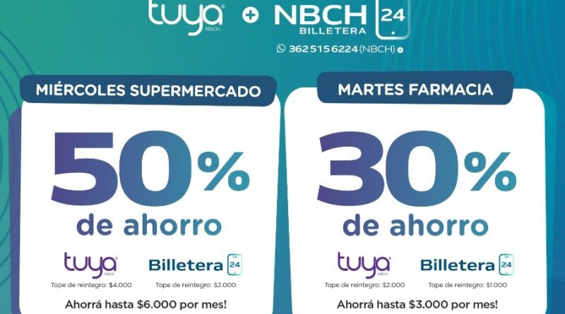 Utilizando la tarjeta Tuya y la billetera digital NBCH24 se puede acceder a descuentos y reintegros que permitirán ahorrar hasta $9.000 mensuales en alimentos y farmacias. La lista completa de comercios adheridos está disponible en https://bit.ly/SuperdiasNBCH.