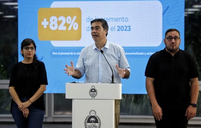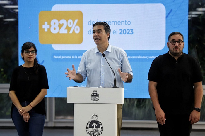 El gobernador Jorge Capitanich, junto a la vicegobernadora Analia Rach Quiroga y al ministro de Planificación, Economía e Infraestructura, Santiago Perez Pons, anunció este sábado los acuerdos salariales alcanzados con representantes de trabajadores estatales. La recomposición representa un aumento superior al 82% durante el 2023 para todos los trabajadores públicos de la administración central, así como de organismos y entes descentralizados y autárquicos.