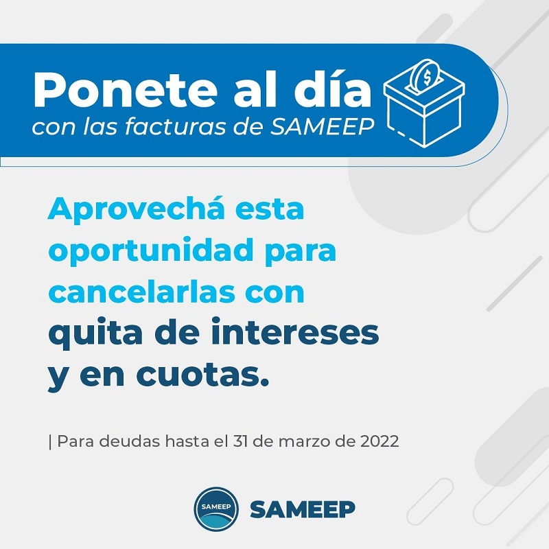 La empresa Sameep informa que está abierta la posibilidad de adherirse a las diferentes moratorias para todos los usuarios que se encuentren con deudas al 31 de marzo de 2022 para regularizarlas en todas las localidades de la provincia (con excepción de Charata que tiene una moratoria vigente), a partir del 2 de mayo y hasta el 31 de julio de 2022.