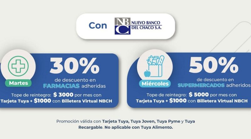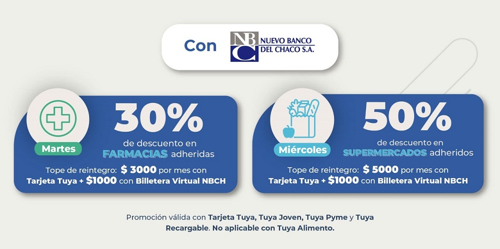 Quienes operen con tarjeta Tuya y Billetera NB24 podrán acceder a los siguientes beneficios: descuento del 30% los días martes en farmacias con un tope de reintegro de $3.000 y los miércoles una bonificación del 50% en supermercados con un tope de reintegro de $5.000. Además, usando la Billetera NBCH24 se suma un reintegro con tope de $1000 en cada caso. Los descuentos podrán ser acumulativos con ambos medios de pago, representando un ahorro de $10 mil por mes.