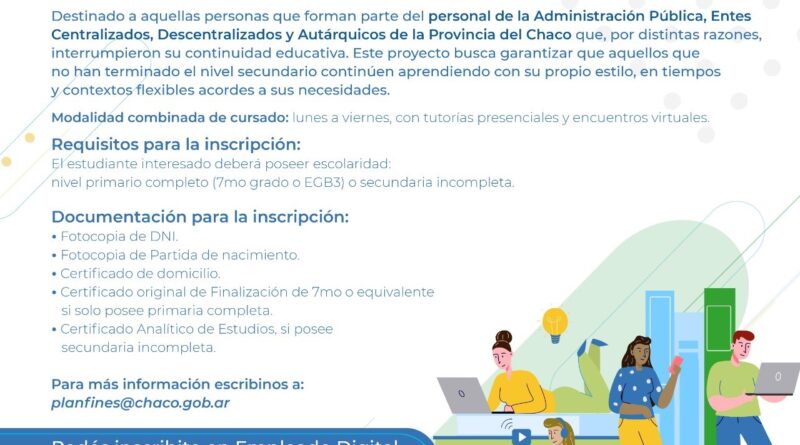 El Gobierno Provincial lanzó el Proyecto Especial “Profesionalización y Jerarquización del Empleado Público” destinado al personal de la Administración Pública, entes centralizados, descentralizados y autárquicos provinciales, para que puedan finalizar sus estudios secundarios en 2 años. Contará con clases presenciales y virtuales, las y los interesados podrán inscribirse a través de la plataforma “Tu Gobierno Digital” hasta el 28 de febrero.