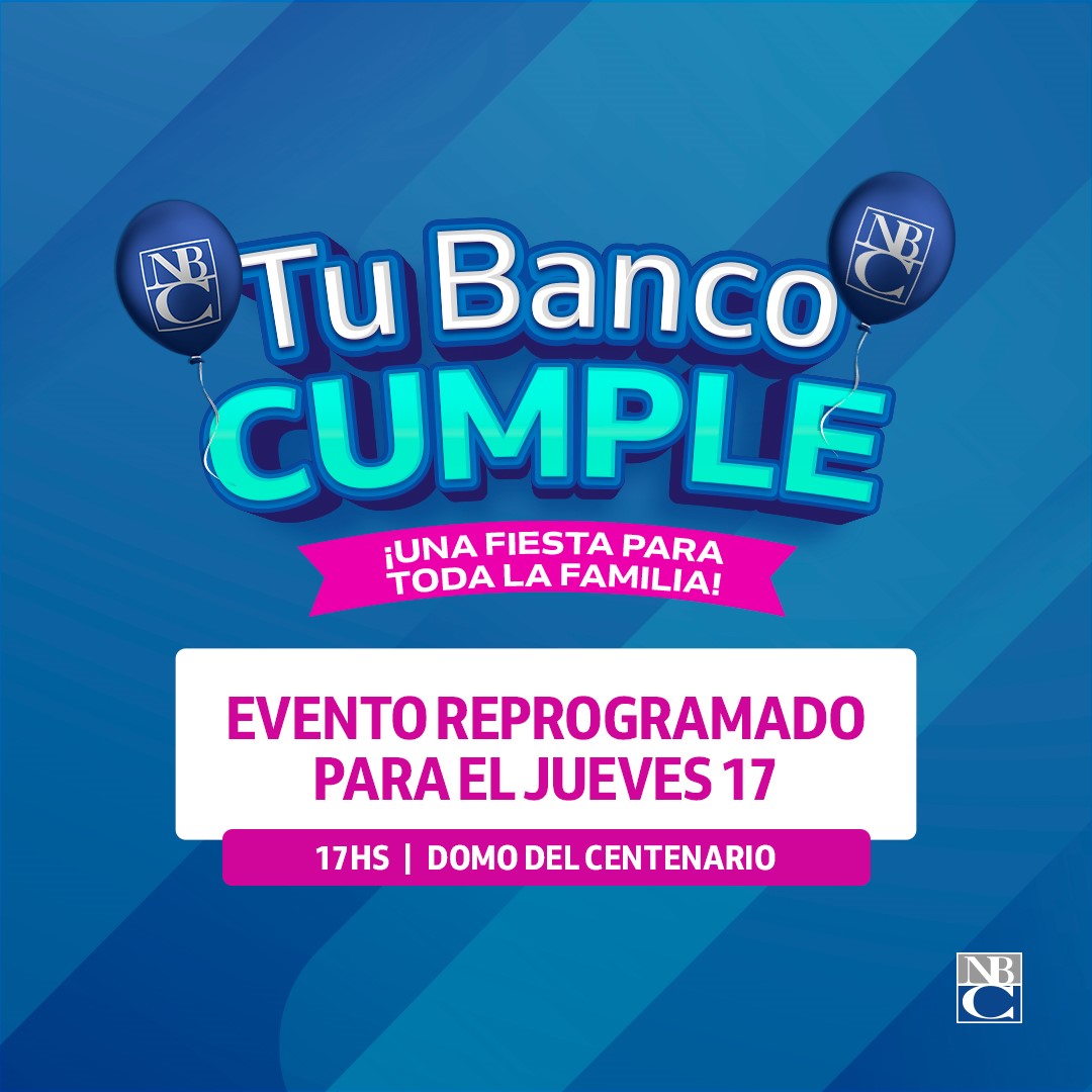 Debido a las inclemencias climáticas previstas para este fin de semana, Nuevo Banco del Chaco reprogramó el evento Tu Banco Cumple para el jueves 17, en el mismo horario de las 17 y en el mismo predio del Domo del Centenario, con la propuesta para compartir en familia.