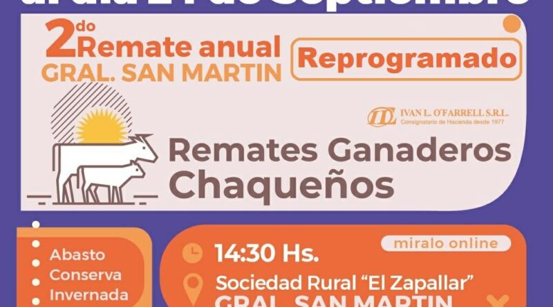 Debido a las lluvias registradas en las últimas horas en territorio provincial, el duodécimo remate ganadero del año para pequeños y medianos productores que debía realizarse este miércoles 22 en Las instalaciones de la Sociedad Rural El Zapallar de General San Martín fue postergado para el viernes 24.
